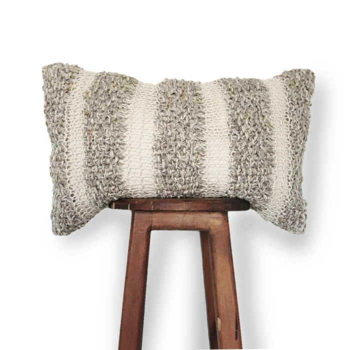 El örgüsü yastık kılıfı. İpliği geri dönüştürülmüş koton iptir. Ölçü, 45x60 cm. Ham pamuklu kumaştan astarlı ve fermuarlı. Kenarları el dikişli. Sadece kılıftır.