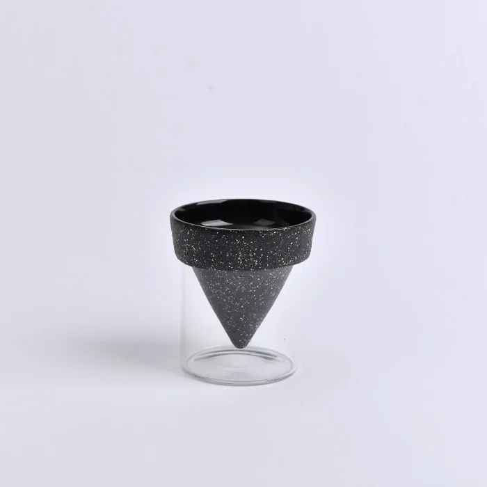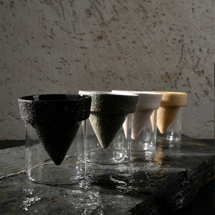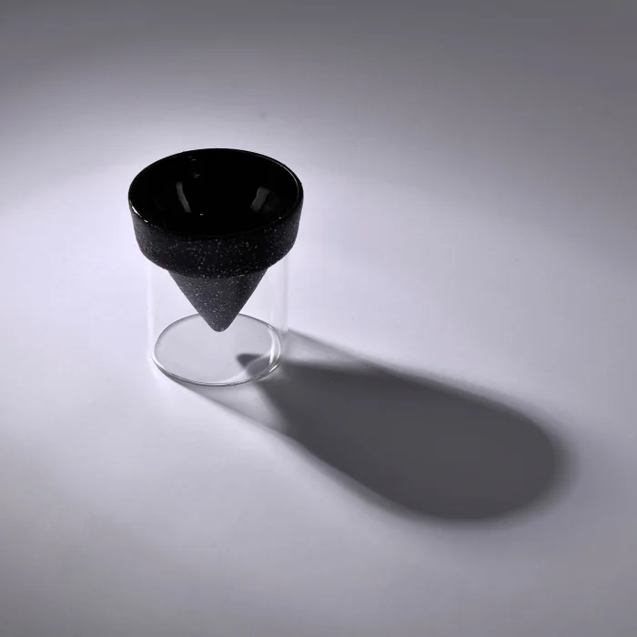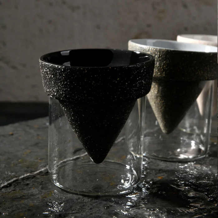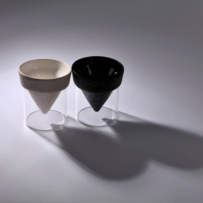 Seramik parça cam parçanın ağız kısmına oturtularak dengede durması sağlanır ve farklı bir bardak deneyimi yaşatır.