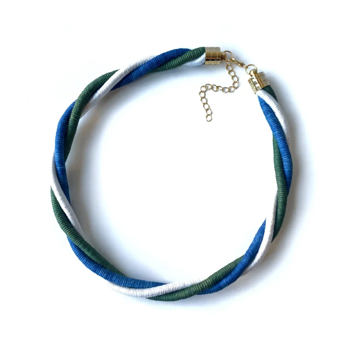 Doğal boyalar ile boyanmış ipek iplikler, pamuk halatlar, altın kaplama pirinç aksesuarlar kullanılmıştır.