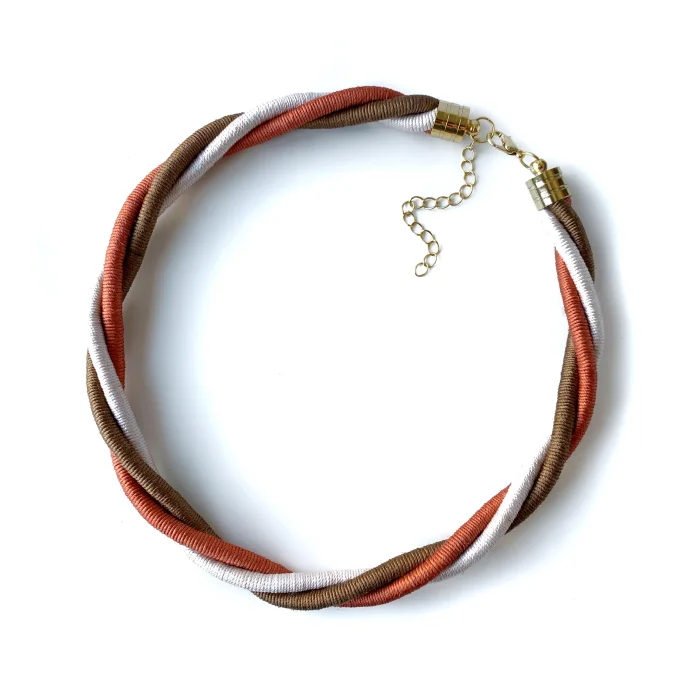 Doğal boyalar ile boyanmış ipek iplikler, pamuk halatlar, altın kaplama pirinç aksesuarlar kullanılmıştır.