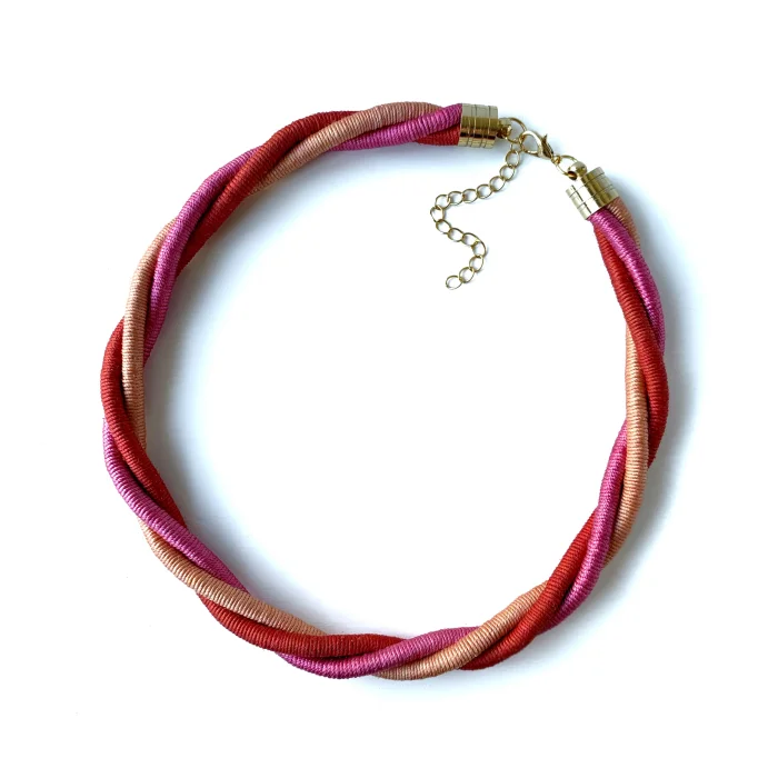 Doğal boyalar ile boyanmış ipek iplikler, pamuk halatlar, altın kaplama pirinç aksesuarlar kullanılmıştır.
