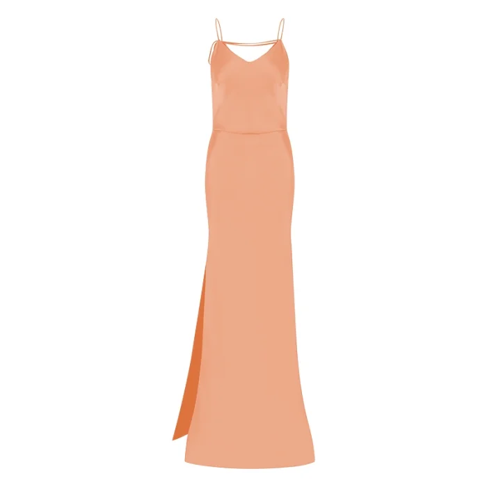 Saten Askılı, Arkadan Bağlamalı, Yırtmaçlı Uzun Gece Elbisesi