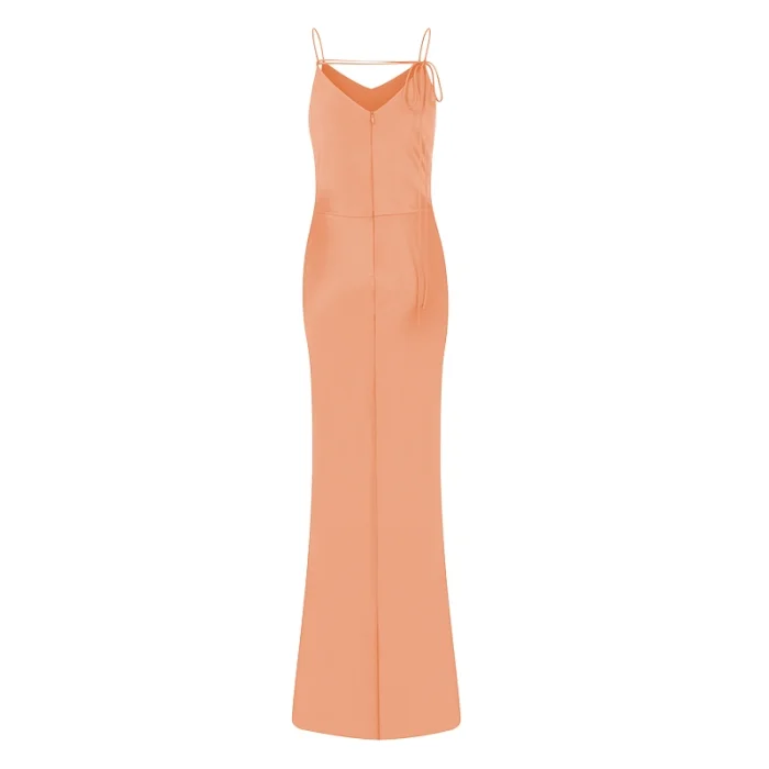 Ürün: Saten Askılı, Arkadan Bağlamalı, Yırtmaçlı Uzun Gece Elbisesi