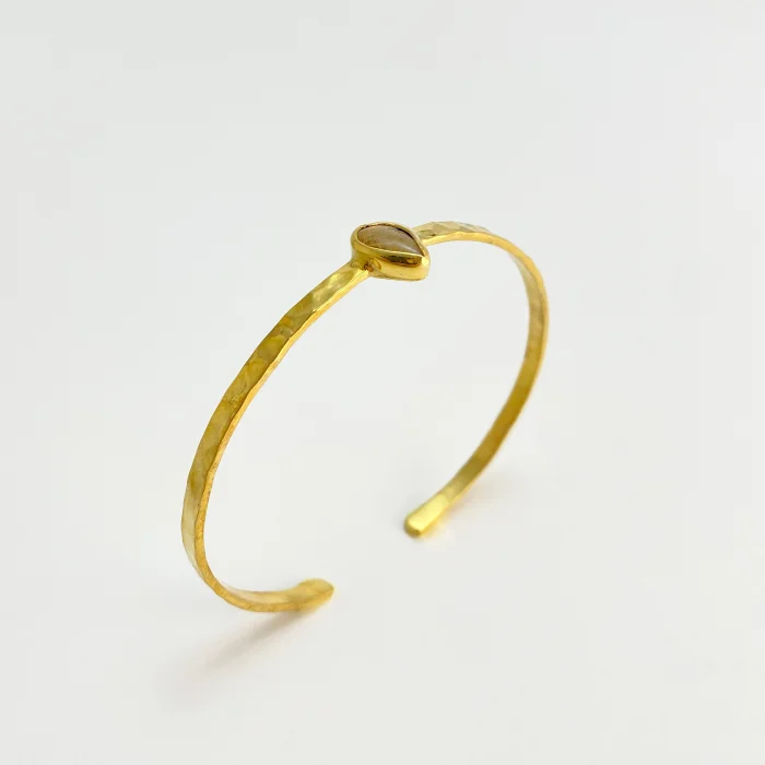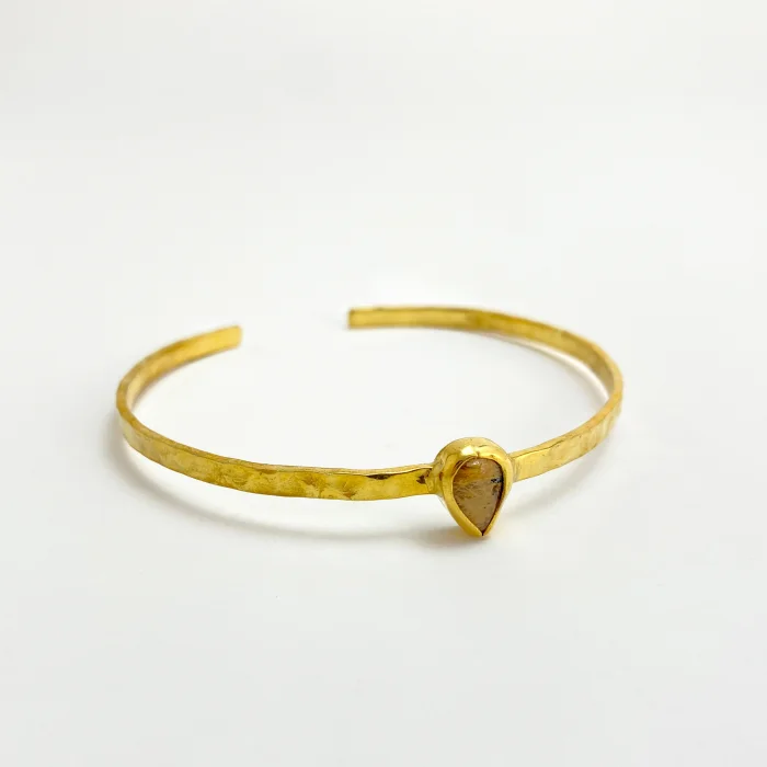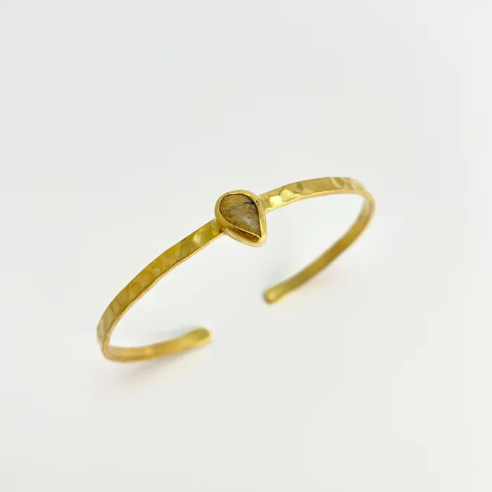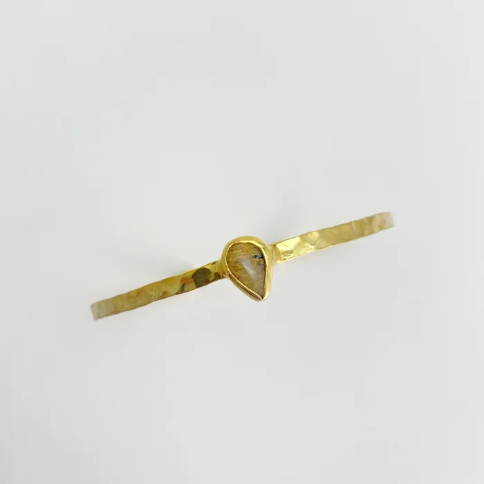 925 ayar gümüş üzeri 18k altın kaplama, damla formunda altın rutilli kuvars taşlı, el yapımı, ayarlanabilir bileklik.