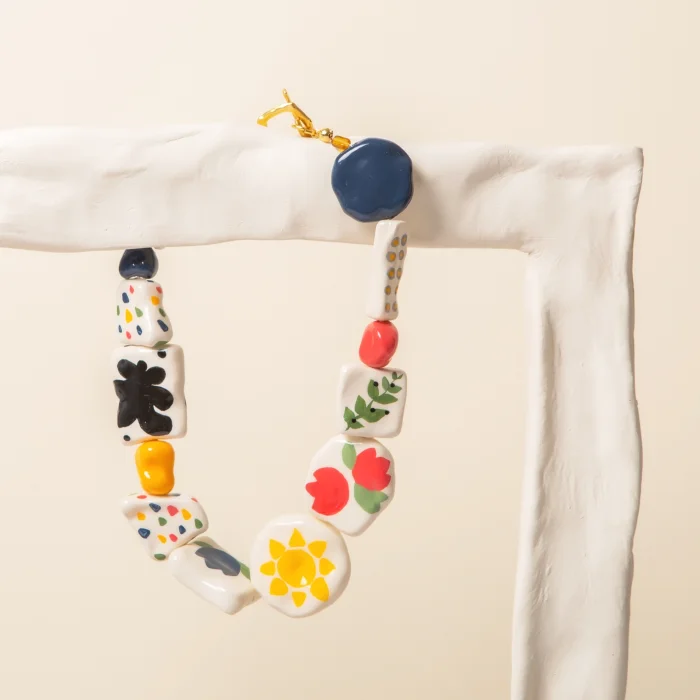 Tüm parçalar kilden elde şekillendirilmiştir, desenleri el boyamasıdır. Metal parçalar altın kaplamadır. İki klips arası kolye uzunluğu 45 cmdir. *Belirtilen ürün ölçüleri yaklaşık değerlerdir, her parça için biraz değişebilir.