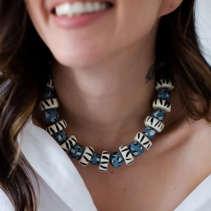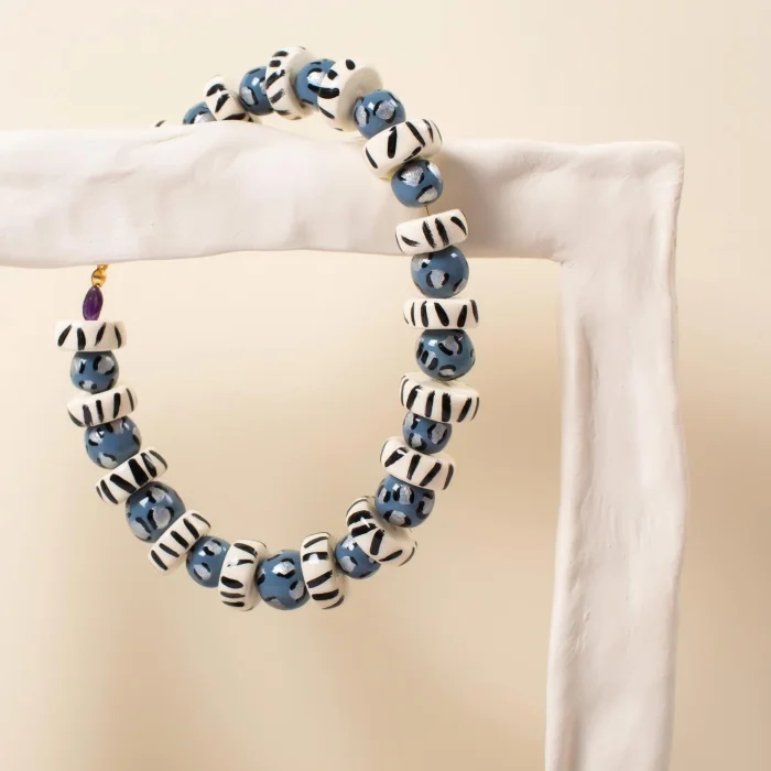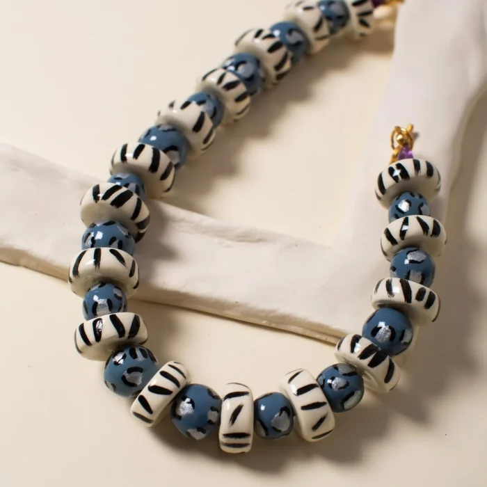 Tüm parçalar kilden elde şekillendirilmiştir, desenleri el boyamasıdır. Metal parçalar altın kaplamadır. İki klips arası kolye uzunluğu 46 cmdir. *Belirtilen ürün ölçüleri yaklaşık değerlerdir, her parça için biraz değişebilir.