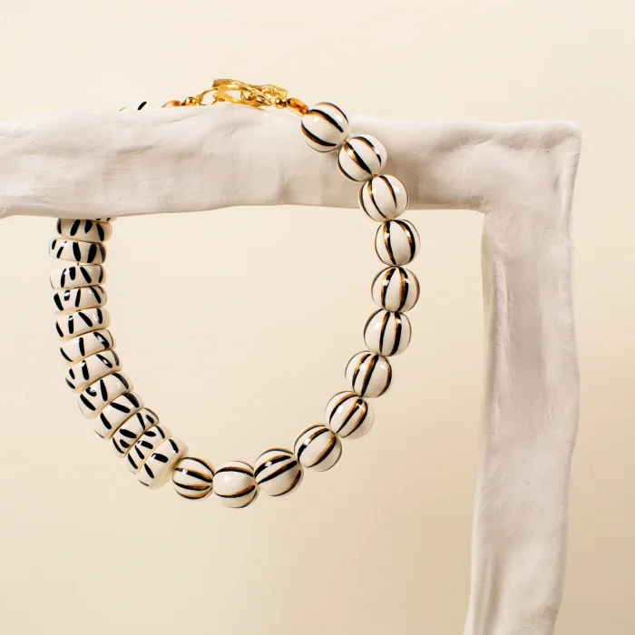Tüm parçalar kilden elde şekillendirilmiştir, desenleri el boyamasıdır. Metal parçalar altın kaplamadır. İki klips arası kolye uzunluğu 46 cmdir. *Belirtilen ürün ölçüleri yaklaşık değerlerdir, her parça için biraz değişebilir.
