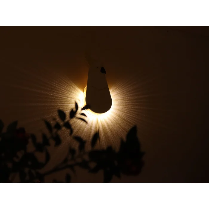 Arkalık PLA (Polyactic Acid) Mısır nişastası ve şeker kamışından üretilen organik biyo-bozunurdur.3 W=40 W enerjiye eşit gün ışığı Led LambaGerilim: 240 V Elektirik bağlantısı ile çalışır.İç mekan kullanımına uygundur.Elde üretilmekte ve elde boyanmaktadır.Boyutlar : H 22cm x W 12 cm x 4 cmAğırlık:200 grKablo Uzunluğu 200 cm Su bazlı akrilik boya ile elde boyanmakta, vernik vb.koruyucu kimyasal içermemektedir.Ürün: Kakadu Duvar Lamba