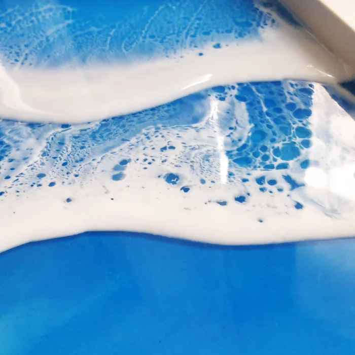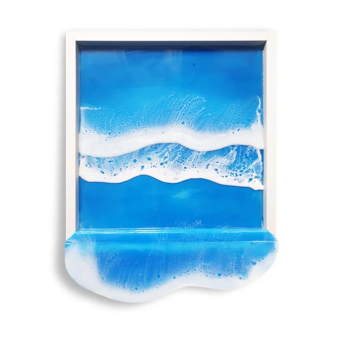 Ahşap zemin üzerine akrilik boyama, üç katmanlı reçine dalgası. - Dalga deseni çerçeveden dışarıya doğru yaklaşık 11 cm taşmaktadır. Çerçeve dahildir. Her parça stüdyomuzda el yapımı üretilmektedir. Reçine çalışılması çok eğlenceli ama bir o kadar da zor bir malzeme olduğu için her parça kendi karakterini geliştirmektedir. Bu yüzden hiçbir çalışma bir diğerinin benzeri olmaz. Dolayısıyla ürünlerimizden satın aldığınızda sadece size özel bir çalışma almış olursunuz. Doğrudan güneş almayan bir yerde sergilenmesi tavsiye edilir.