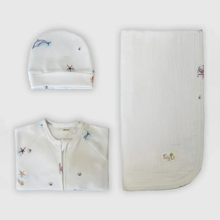Ürün: Ocean Desenli Organik Pamuk Yenidoğan Hastane Çıkış Seti