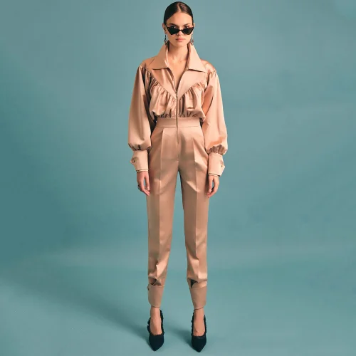Dik yaka ,gömleği büzgülü, önden fermuarlı ,balon kol ,bele oturan ,paçası ve kolları takma manşetli saten tulum.
