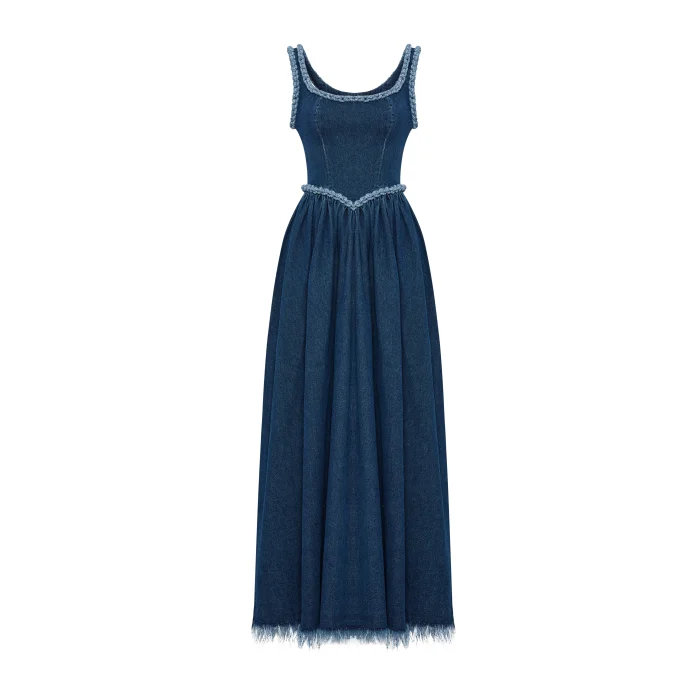 Bu özel parça, denim kumaşını vintage dokunuşlarla modernize ederek zarafet ve stili bir araya getiriyor. Yaka kısmındaki el yapımı örgü süslemeler, derin kare yaka ve bedene göz alıcı bir vurgu katıyor. Korsaj kesimi, belde çarpıcı bir görünüm sağlayarak elbisenin zarafetini artırıyor. Bu elbise, Luce Del Sole koleksiyonunun imza parçalarından biri olarak öne çıkıyor.