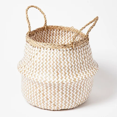 Beyaz Zigzag Hasır Saksılık Sepet – Çap 35 cm, Yükseklik 32 cm