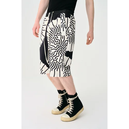 Unisex şortlar S/M ve L/XL bedenlerde tasarlanmıştır. %100 doğal elyaftan dokunmuş gabardin kumaş kullanılarak üretilmiştir. Model, 90/70/90 vücut ölçülerine sahip, 185 cm boyunda ve L/XL beden giymektedir.