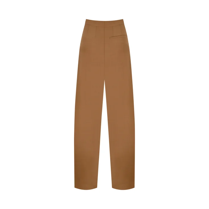 Woolen brick-colored trousers. Concealed rack and zipper closure. The front is double pleated. Loose fit. Her height is at heel level.