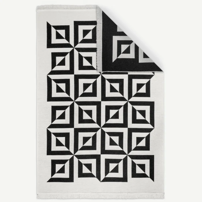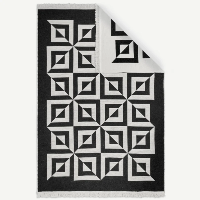 Op Art Illusion Flat Weave Mid Century Rug Black Geometric Retro Area Accent Runner Rug Designer : Uğur Şayan Machine-woven reversible rug from recycled cotton. Reversible design. Its Vegan, by the way :) Rugs are in this collection; made with recycled cotton, natural cotton and fibers. Origin - Turkey This product is a Retrospektif™ group product.