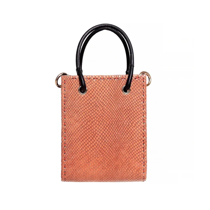 Hand stitched leather bag Dimensions: W 150mm, H 180mm, D 60mm Raw leather handles and optional shoulder strap 900mm Laminated textile lining