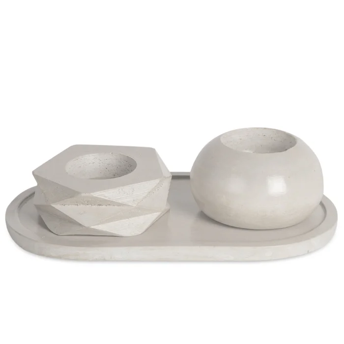 The contents of the concrete candle holder set consisting of 3 pieces in total: 2 tealight holders 1 mini tray
