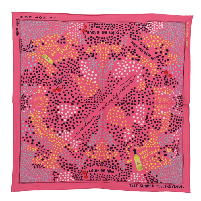 Desenler elde çizilmiş, dijital olarak basılmıştır. %100 pamuk kumaş. Kenarları el dikişi ile çevrilmiştir.