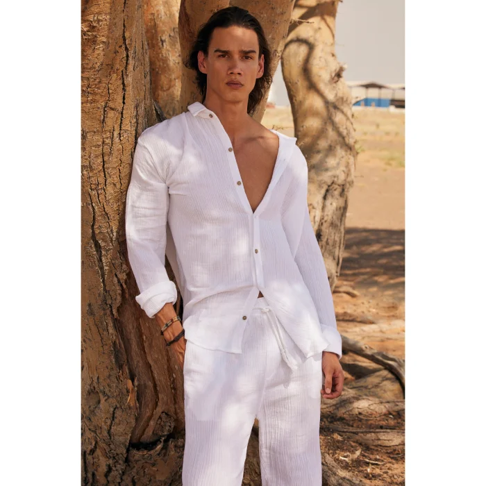 Shirt: -Relaxed fit, -Made of 100%Cotton muslin, -Spread collar, -Button fastening, -Buttoned cuffs, -Back center pleated, -Quick-drying, -Does not require ironing \ Pant: -Relaxed fit, -Made of 100%Cotton muslin, -Spread collar, -Button fastening, -Buttoned cuffs, -Back center pleated, -Quick-drying, -Does not require ironing