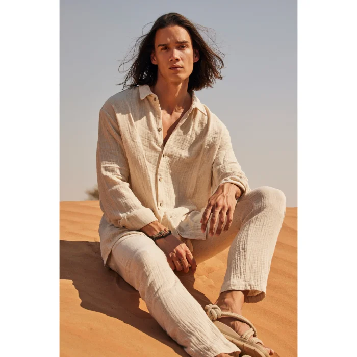 Shirt: -Relaxed fit, -Made of 100%Cotton muslin, -Spread collar, -Button fastening, -Buttoned cuffs, -Back center pleated, -Quick-drying, -Does not require ironing \ Pant: -Relaxed fit, -Made of 100%Cotton muslin, -Spread collar, -Button fastening, -Buttoned cuffs, -Back center pleated, -Quick-drying, -Does not require ironing