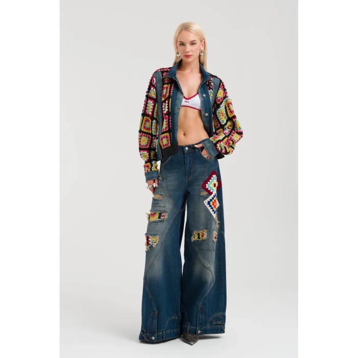 Designed for those who love unique styles, this women's denim jacket comes in XS, S, M, and L sizes. Featuring boho-inspired crochet details on the sleeves, this jacket is both stylish and comfortable, adding a distinctive touch to your everyday outfits.