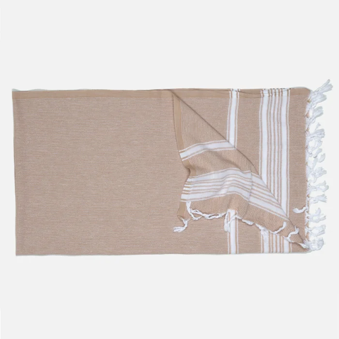 A waffle textured peshtemal ,simple, soft ,super lightweight but very water absorbent. Tasseled and have stripes on the ends.