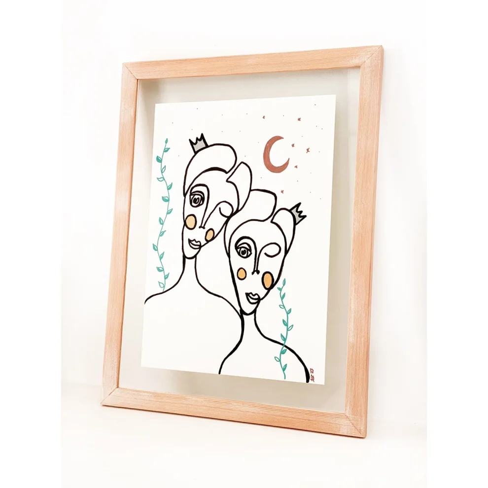 Material: acrylic paint, pencil and water-based marker on 290 g of white paper. Double glazing, wooden frame.