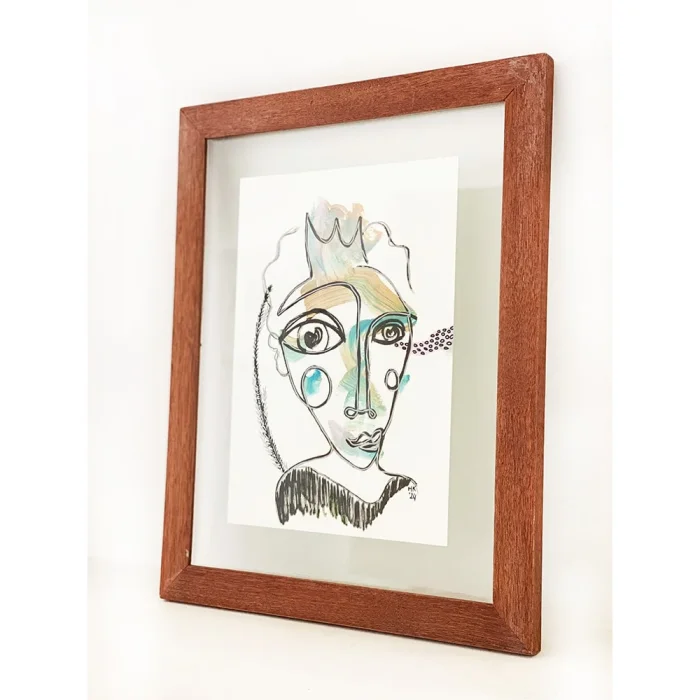 Material: acrylic paint, pencil and water-based marker on 290 g of white picture paper. Double glazing, wooden frame.