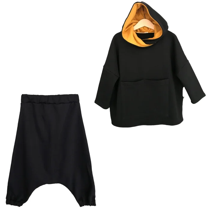 Black 2 Thread Combed Cotton Fabric, Long Sleeved, Hooded with Mustard Color Inside, Kangaroo Pocket Sweatshirt and Low Crotch Harem Pant Suit