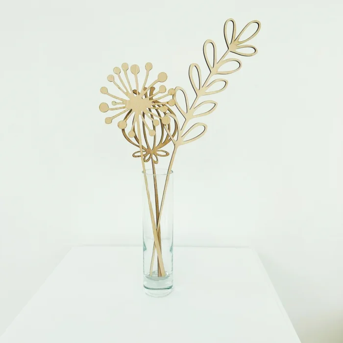-Our plants are produced from 3 mm birch plywood. It is a total of 5 pieces, including 4 plants and 1 vase. -Keep away from humid environments. -The vase is glass. There is a foil label on it. - Suitable for indoor use. -Due to the nature of the material, different patterns can be seen on the surfaces. Cleaning and Maintenance -Clean it gently with a dry cloth without using any chemicals. -Do not interfere with the surface with tools such as cutters and drills. -The vase is suitable for hand washing. PRODUCT: FLORA FLOWER BOUGHT (VASE) DESIGNER: FAMNDESIGN PRODUCT SIZE: VASE DIMENSIONS 5CM X19 CM FLOWER DIMENSIONS (THE LARGEST IS 40CM X 7CM) PRODUCT CODE: FLR-02