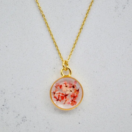 The way the tiny flowers are arranged is unique and no part will be the same as the other, the product will be exclusive only to its owner.The metal parts of the product and the chain are 14 karat gold plated.