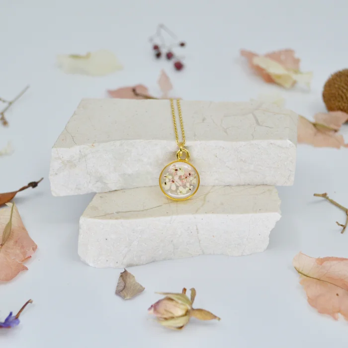 The way the tiny flowers are arranged is unique and no part will be the same as the other, the product will be exclusive only to its owner.The metal parts of the product and the chain are 14 karat gold plated.