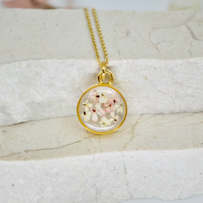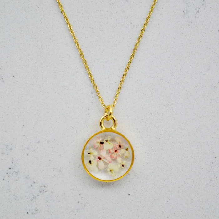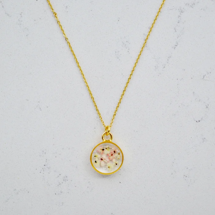 Each piece is filled with particles of Queen Anne's Lace flower, which are collected one by one by hand and then carefully plucked from the stem and pressed and dried.After the drying stage, these particles are carefully placed in handmade gold-plated frames and brought together with jewelry-grade crystal resin.