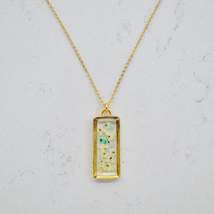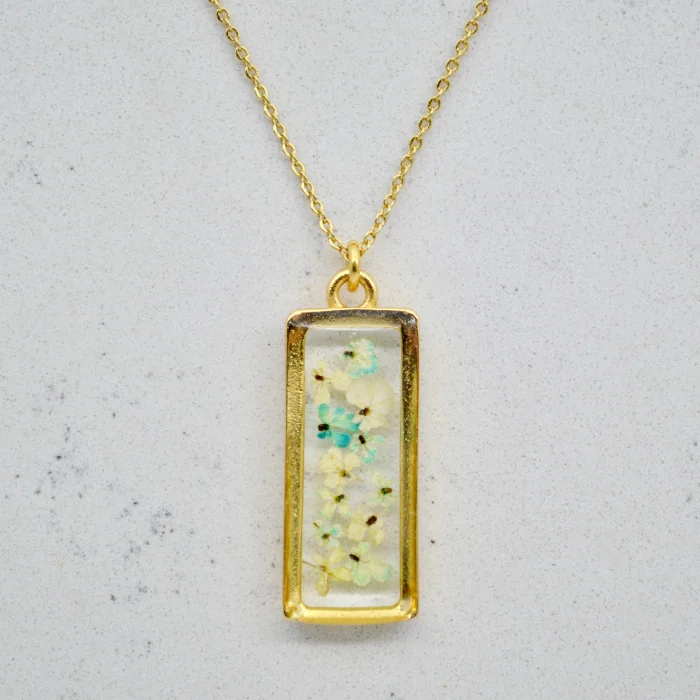 Each piece is filled with particles of Queen Anne's Lace flower, which are collected one by one by hand and then carefully plucked from the stem and pressed and dried.After the drying stage, these particles are carefully placed in handmade gold-plated frames and brought together with jewelry-grade crystal resin.