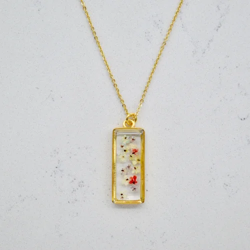 Each piece is filled with particles of Queen Anne's Lace flower, which are collected one by one by hand and then carefully plucked from the stem and pressed and dried.After the drying stage, these particles are carefully placed in handmade gold-plated frames and brought together with jewelry-grade crystal resin.