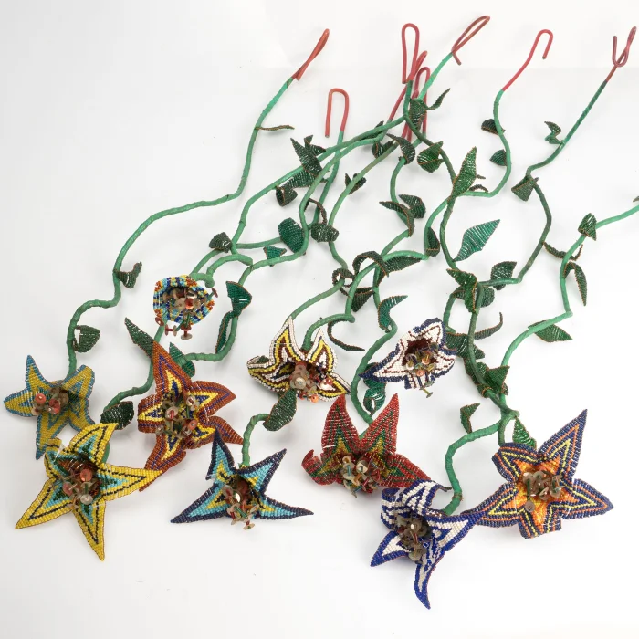 12 different colored beading flowers are 11 cm in diameter with five petals open. One is bud-shaped and each is hand-knitted with different color bead combinations. Since the handles are wire, you can give it the form you want. They are about 65 cm long. A unique collection item.