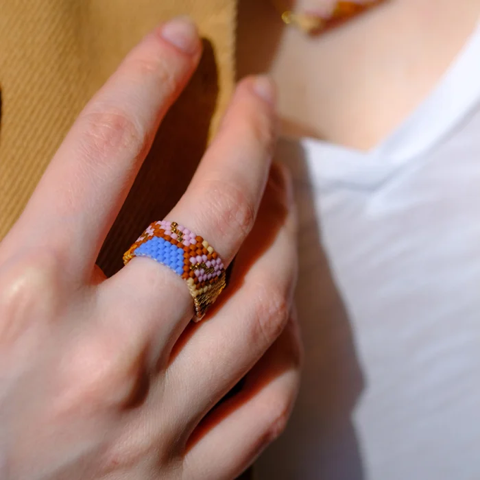 Rings are handsewn with glass beads. It is pretty robust and will not be damaged unless it is forced. It is not flexible and does not stretch much over time. There is no harm in contact with water.