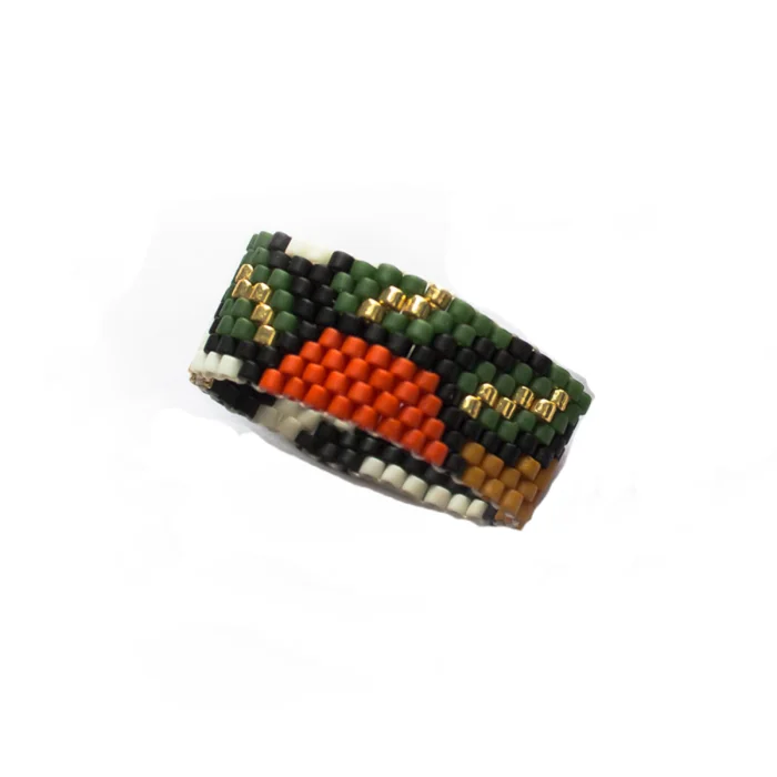 Rings are handsewn with glass beads. It is pretty robust and will not be damaged unless it is forced. It is not flexible and does not stretch much over time. There is no harm in contact with water.
