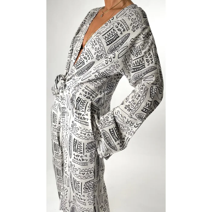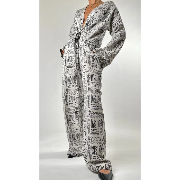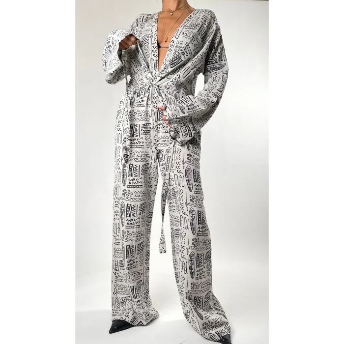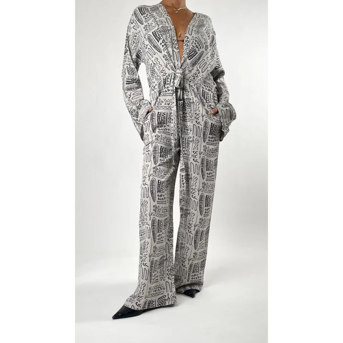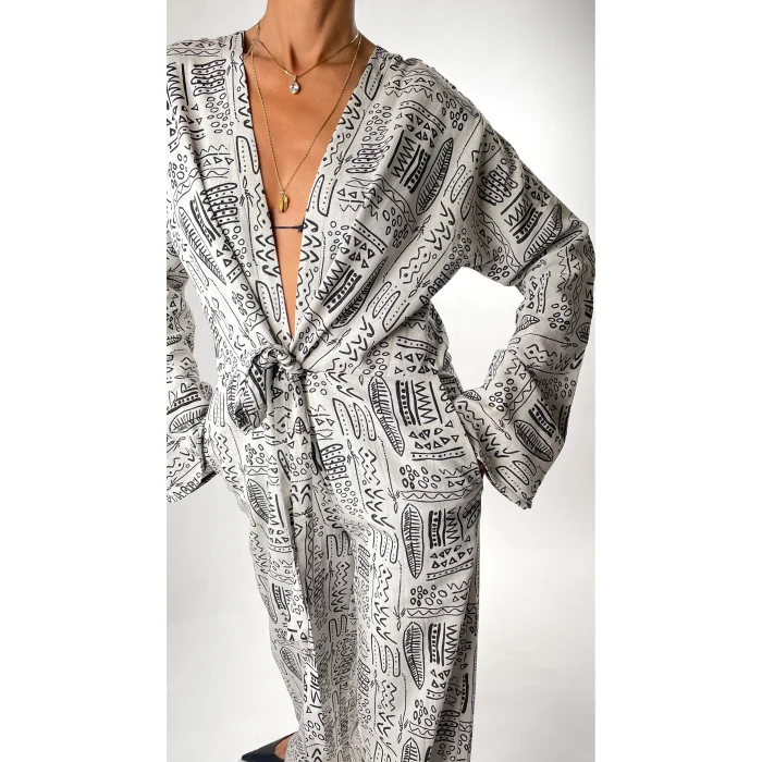 V-neck. It should be tied from the front. Plenty of trotters. With 2 pockets. Oversize.