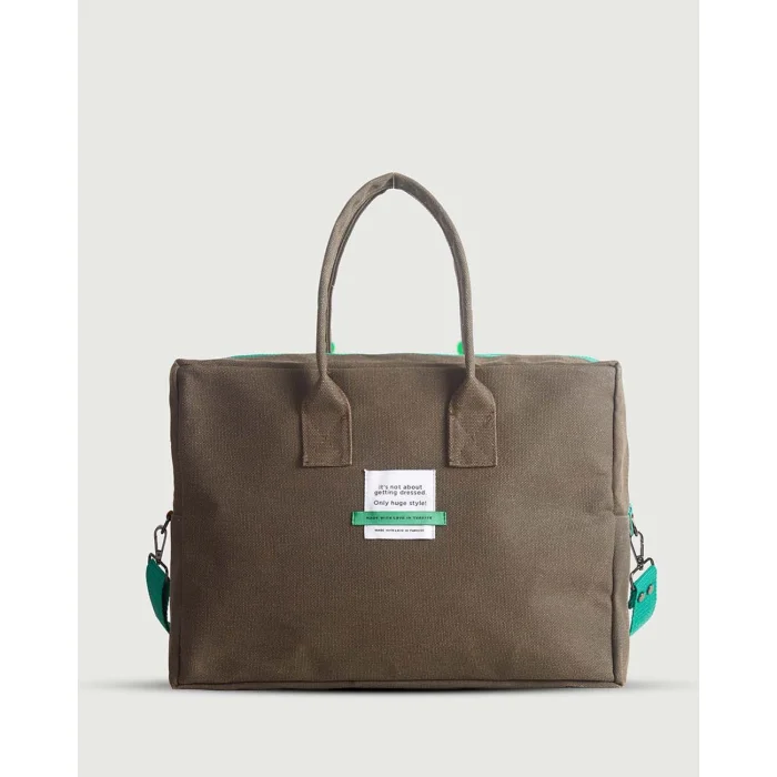 Huge Element Latt Bag Dark Brown color bag made of waxed canvas fabric; It has a green bone zipper and is delivered with a green 130 cm cotton narrow woven bag strap. For product cleaning and maintenance; The contaminated area is rubbed with a warm and damp cloth. It should be left to dry in a cool and dry place away from direct sunlight. Professional support should be sought for stubborn stains. Washing in the washing machine and ironing are not recommended. It is produced entirely by the labor of female employees in Turkey.