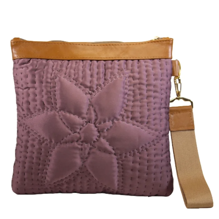 It is made with the traditional quilting technique. The main fabric is Silk Satin, lined with pockets inside. The mouth is 100% leather. Detachable wrist strap.