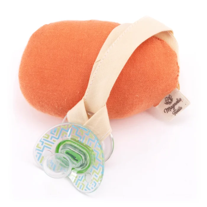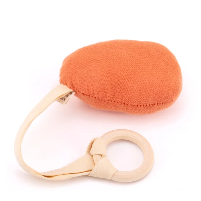 The teether/pacifier holder, which we produce from super soft, organic, handmade 2-ply muslin fabric, is in the shape of a cute egg. Your baby can hold the egg-shaped toothpiece with his hand, stimulating his senses and supporting the development of his motor skills. It can be a baby's first toy.