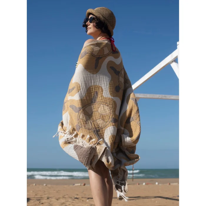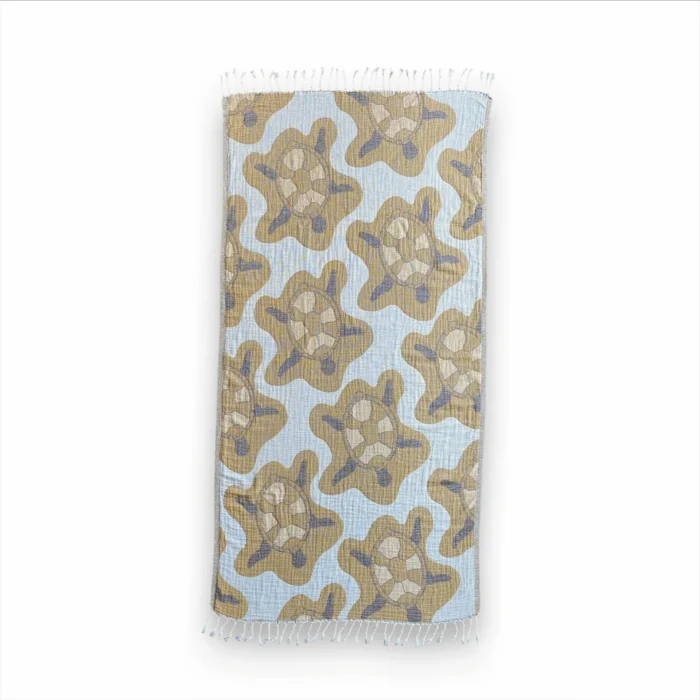 100% cotton woven towel, pre-washed. It is absorbent, dries quickly, takes up little space and is lightweight.
