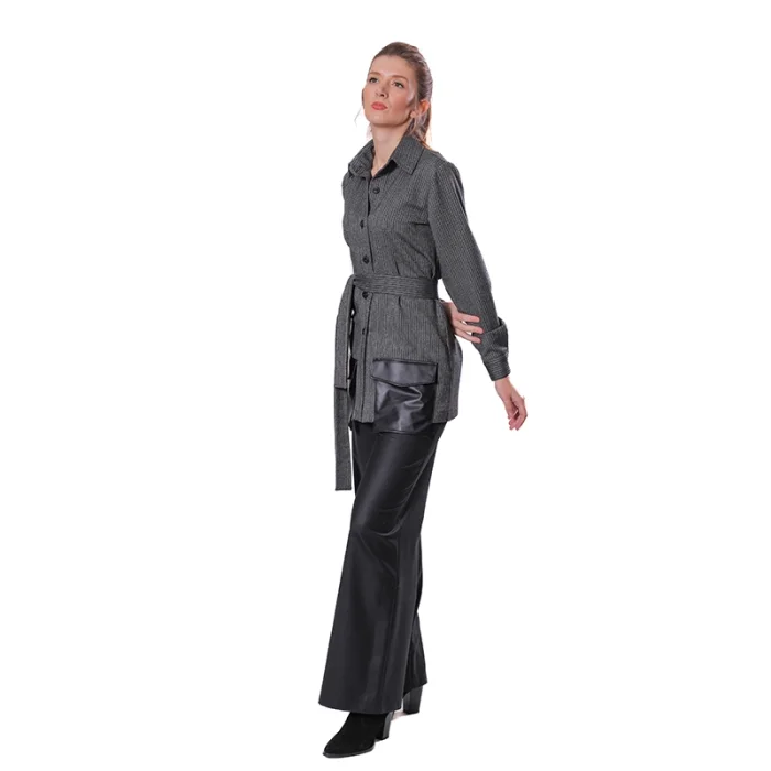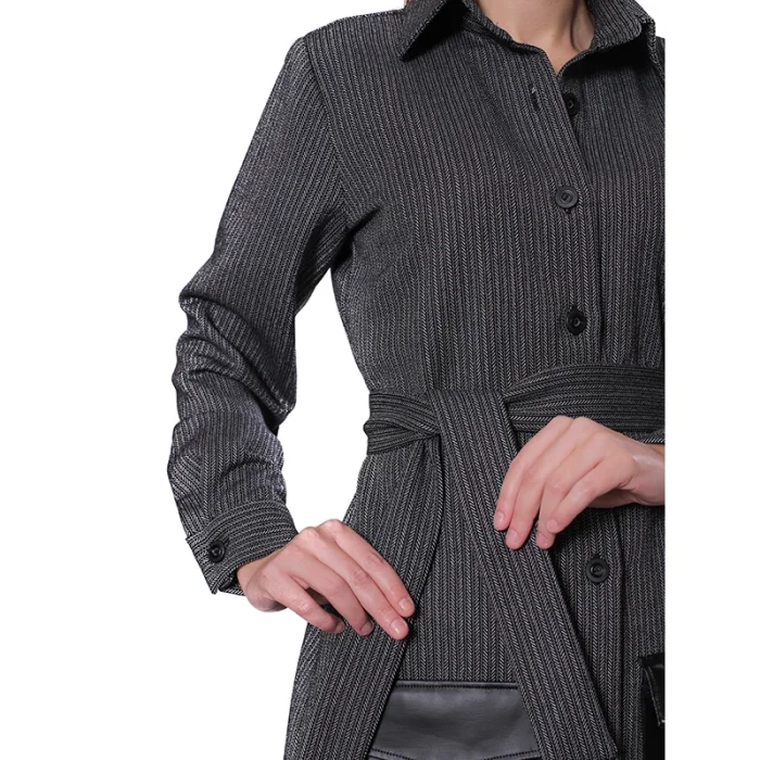 - Model: Belt at the waist, Leather Pocket Detail, Cuff on the Arm, Front Placket