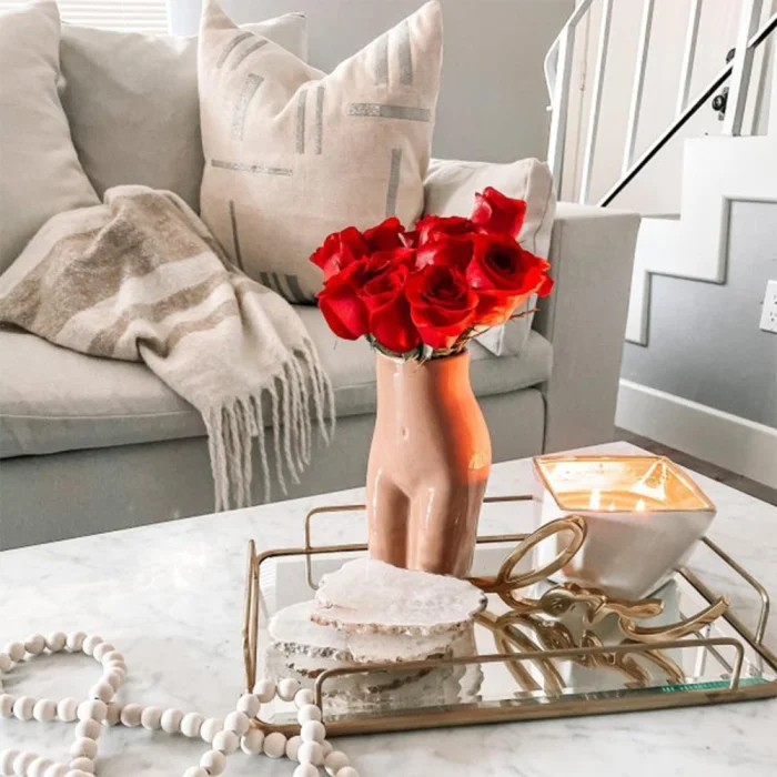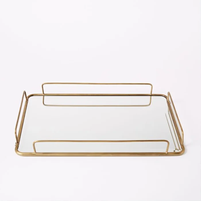 It is made of metal material and painted with gold color oven paint. Tray base is mirror.