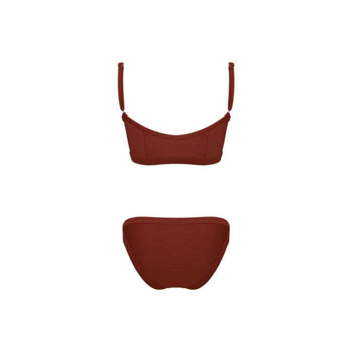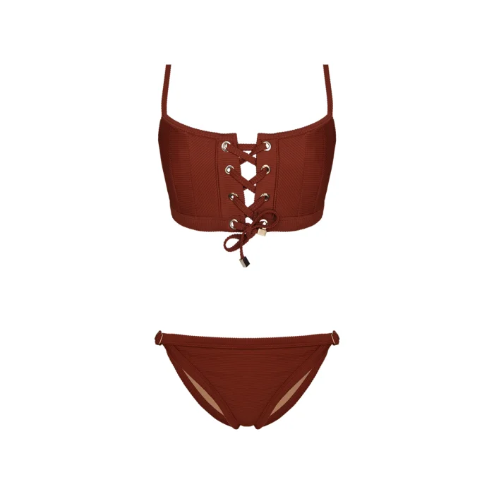 Structured corset with fused binding of textured ribbed fabric. Lace up front with light gold eyelets, featured with adjustable thin straps. Smooth stretch lining for extra comfort. Binded bikini bottom with adjustable side tabs.