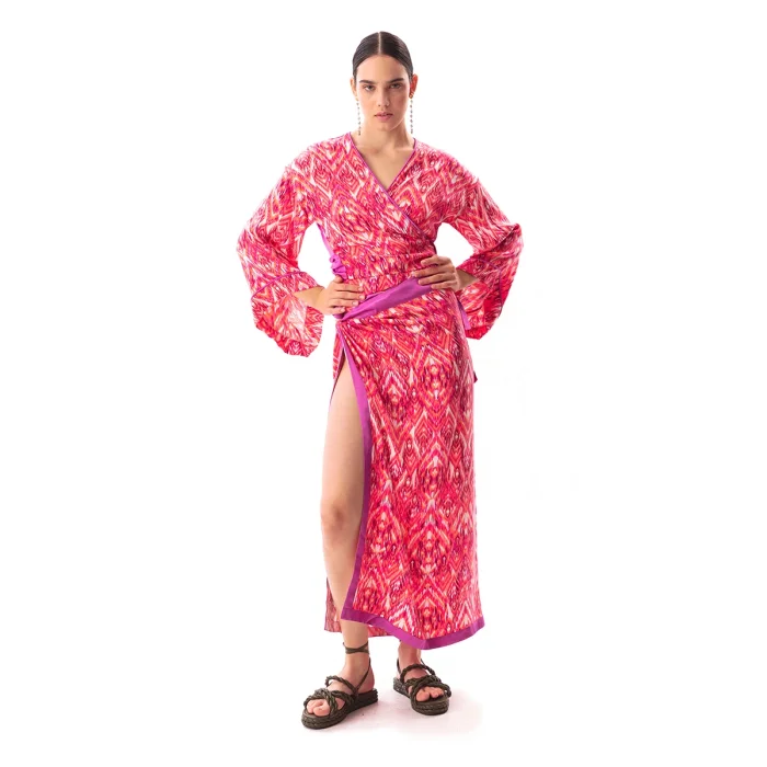 •Tie front style crop top. •Featuring wide sleeves. •Can be worn as envelope style by wrapping around on waist. •Soft silky vegan fabric. • The product size worn by the mannequin in the picture is XS-S • Model dimensions: 83/58/94