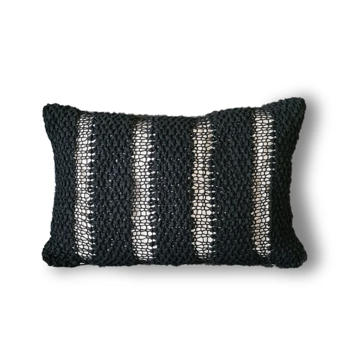 Hand knitted cushion cover. Cover Size: 45 x 60 cm. Colour:  Natural. Fibre: Recycled cotton & natural cotton fabric backing with zipper. Ornament: Hand stitching.