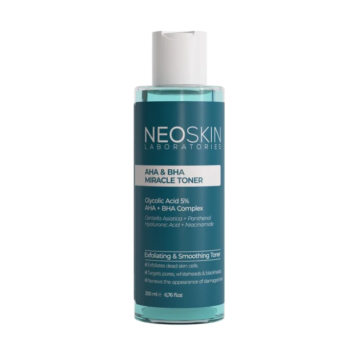It gently removes dead skin cells, dirt, make-up residues and roughness from the skin, helps to reduce the appearance of clogged pores and to establish oil balance in the skin. It helps to eliminate tone inequalities in the skin, increase skin elasticity, and give the skin a softer and smoother appearance. Neoskin AHA & BHA Miracle Toner helps to purify the skin from dead skin cells, excess sebum and oil, open clogged pores with BHA and revitalize the skin with AHA. Its formula containing 5% glycolic acid offers daily exfoliation care to the skin and supports skin refreshment and revitalization. The strong synergy arising from the combination of AHA and BHA is supported by herbal ingredients so that sensitive skin can use it and increase its effectiveness. The Centella asiatica extract in its content works to soothe the skin, equalize the skin tone and repair the skin. Panthenol helps to reduce sensitivity caused by skin problems, soothe irritated skin. Niacinamide, one of the star ingredients added to its powerful formula, works to balance the amount of sebum on the skin and fade acne scars, helping the skin to regain its natural brightness. With Hyaluronic acid, which has a water holding capacity of 1000 times its weight, it deeply moisturizes the skin and keeps the skin moist all day long. Neoskin AHA & BHA Miracle Toner, which has a blue and dense consistency, does not contain artificial fragrances, artificial colorants, alcohol and mineral oils. The cruelty-free formula has been developed without testing on animals. Ingredients: Aqua, Glycolic Acid, Propylene Glycol, Centella Asiatica Leaf Extract, Panthenol, Citric Acid, Salicylic Acid, Lactic Acid, Malic Acid, Gluconic Acid, Ascorbic Acid, Tartaric Acid, Niacinamide, Copper Tripeptide-1, Sodium Hyaluronate, Pentylene Glycol, 1,2-Hexandiol, Phenethyl Alcohol, Cocamidopropyl Betaine, Potassium Sorbate, Tetrasodium EDTA.